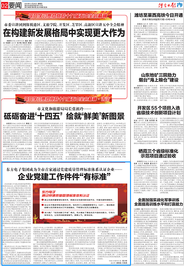MK·体育(中国)官方网站-登录入口,党建实现标准化,给全市国有企业提供了典范。市国资委党委副书记、副主任王洪祥表示,东方电子作为烟台市首个将党建工作纳入ISO9001党建标准质量管理体系进行系统化、标准化建设的先行实践企业,将为我市国有企业新时期党的建设创新提供鲜活的思路与经验,为市管企业今后在党建工作系统化、规范化、科学化建设做出了有益探索和创新。“这种模式完全可以尝试在全市国有企业进行复制、推广,以高质量党建引领国有企业实现高质量发展。”王洪祥如是说。