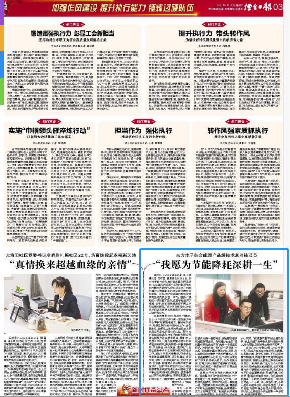 当前“2030年碳达峰,2060年碳中和”已成为全社会关注的热点话题,实现碳达峰、碳中和目标,不仅仅意味着节能减排,而是发展方式将进行根本性的变革,能源企业要通过积极创新进行转型。孙英英说:“这对我个人的研究方向和领域是比较合题的,我非常愿意将这个课题做大做实做深,我们东方电子的企业愿景就是‘珍爱环境,节约资源’跟国家战略相吻合,在这里能给我提供一个研究、创新的平台。可以说公司是一个小家,从小家到大家,小家一起行动起来以后,相信中国这个大家的能效利用环境会有很大的提升的。所以说,让我在这个领域深耕一辈子的话,我是非常愿意的。”