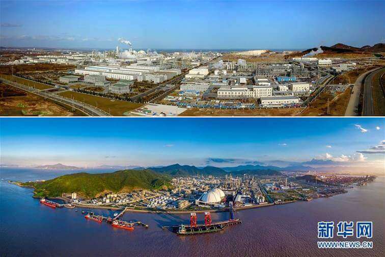 上图:万华烟台工业园航拍画面(2018年12月4日无人机拍摄,新华社记者郭绪雷摄);下图:万华宁波公司全景图(资料照片)。新华社发